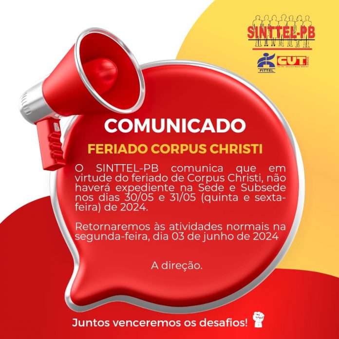 HomeNotícias Notícias Expediente do Sinttel-PB no Corpus Christi Por Sinttel Paraíba 28 de maio de 2024 0 176 FacebookTwitterPinterestWhatsApp Share FacebookTwitterPinterestWhatsApp Previous articleFeliz Natal e Próspero Ano Novo!Next articleSinttel-PB em Audiência Coletiva do MPT